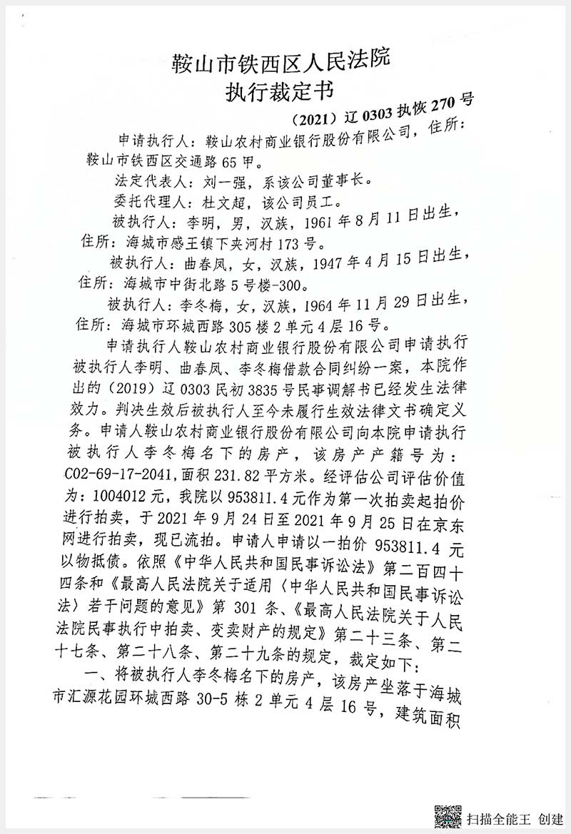 109號 海城市興海管理區站前街三明委匯源花園環城西路30-5棟2單元4層16號房產