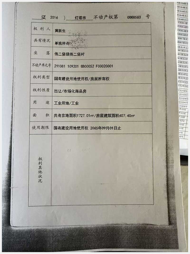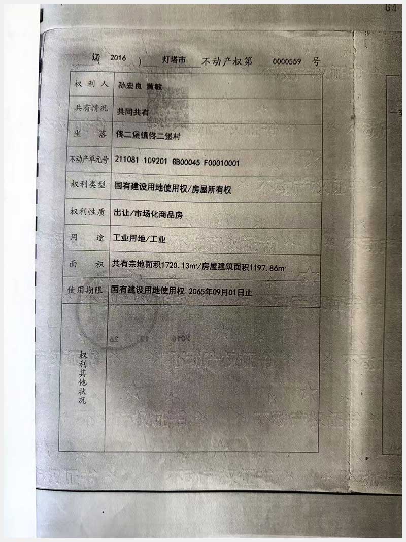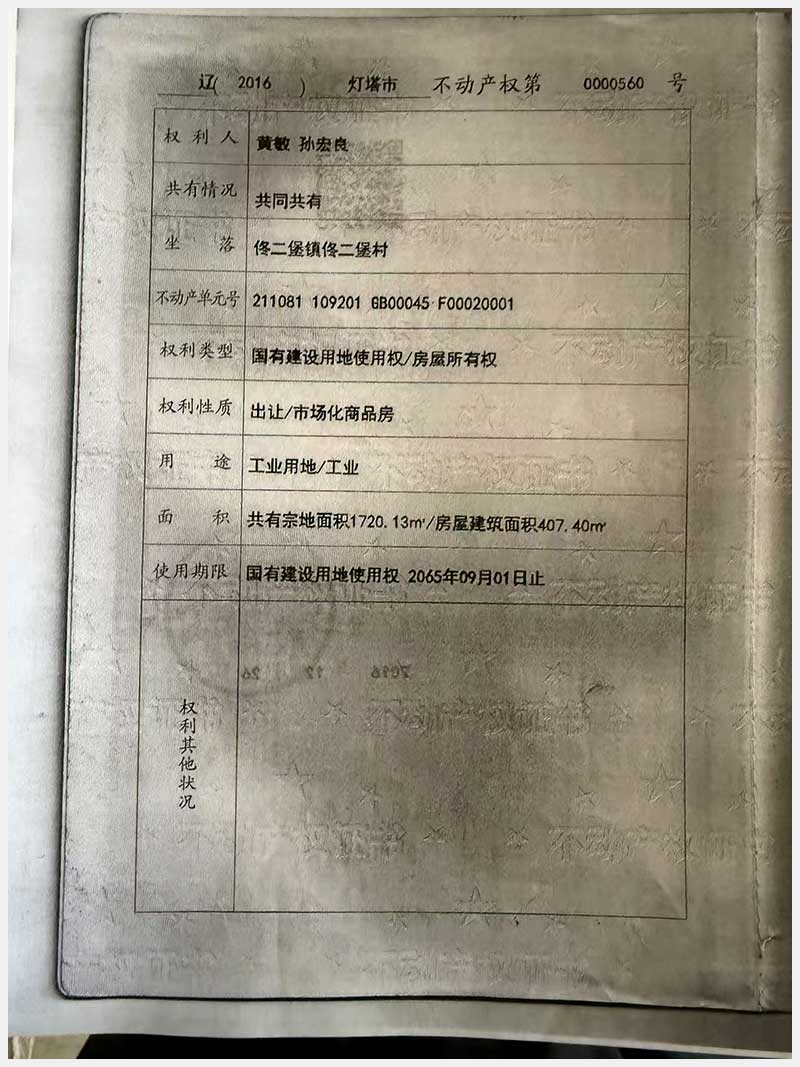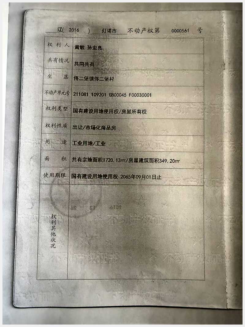 名稱:燈塔市佟二堡鎮佟二堡村房產及土地使用權 面積:房產:1954.46㎡;土地:1720.13㎡ 瀏覽次數:21