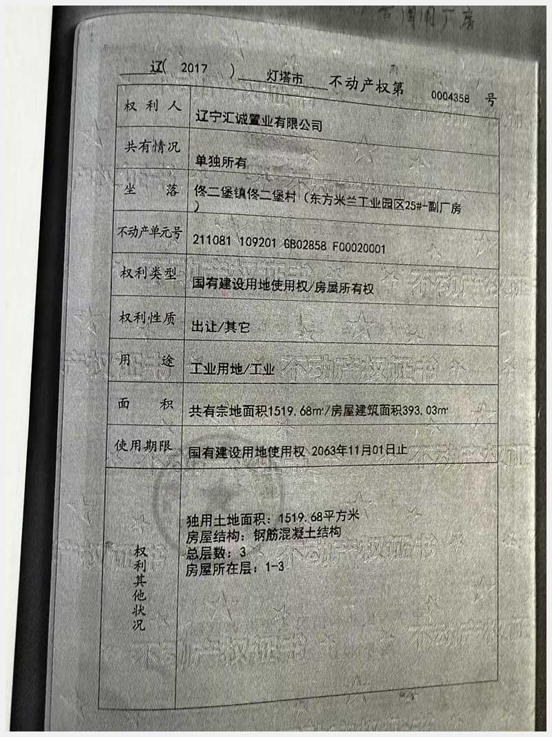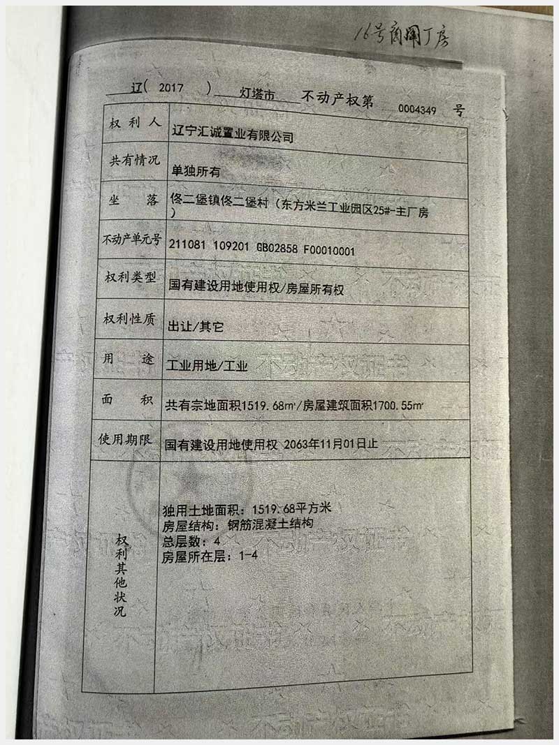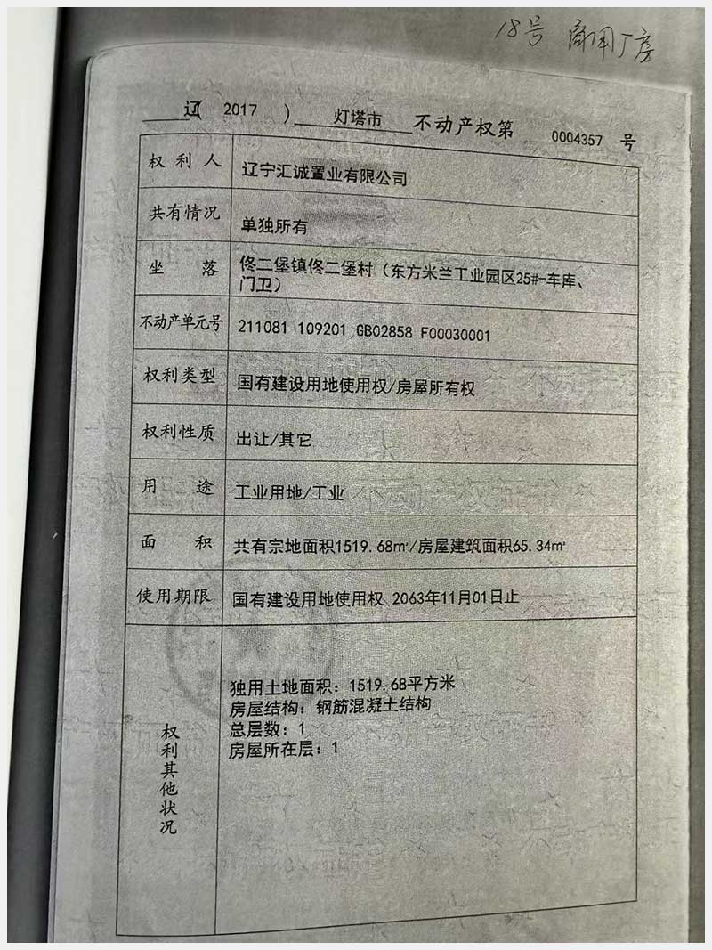 名稱:燈塔市佟二堡鎮佟二堡村東方米蘭工業園區25#房產及土地使用權 面積:房產:2158.92㎡;土地:1519.68㎡ 瀏覽次數:24