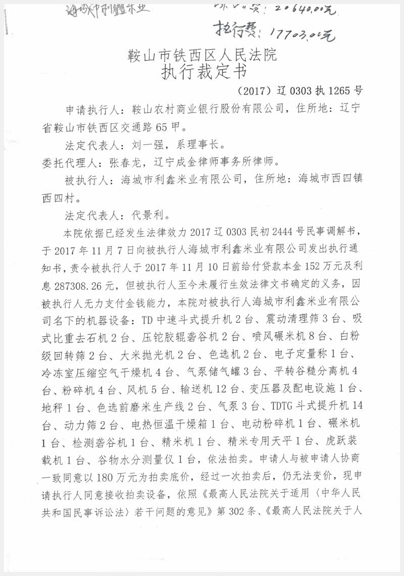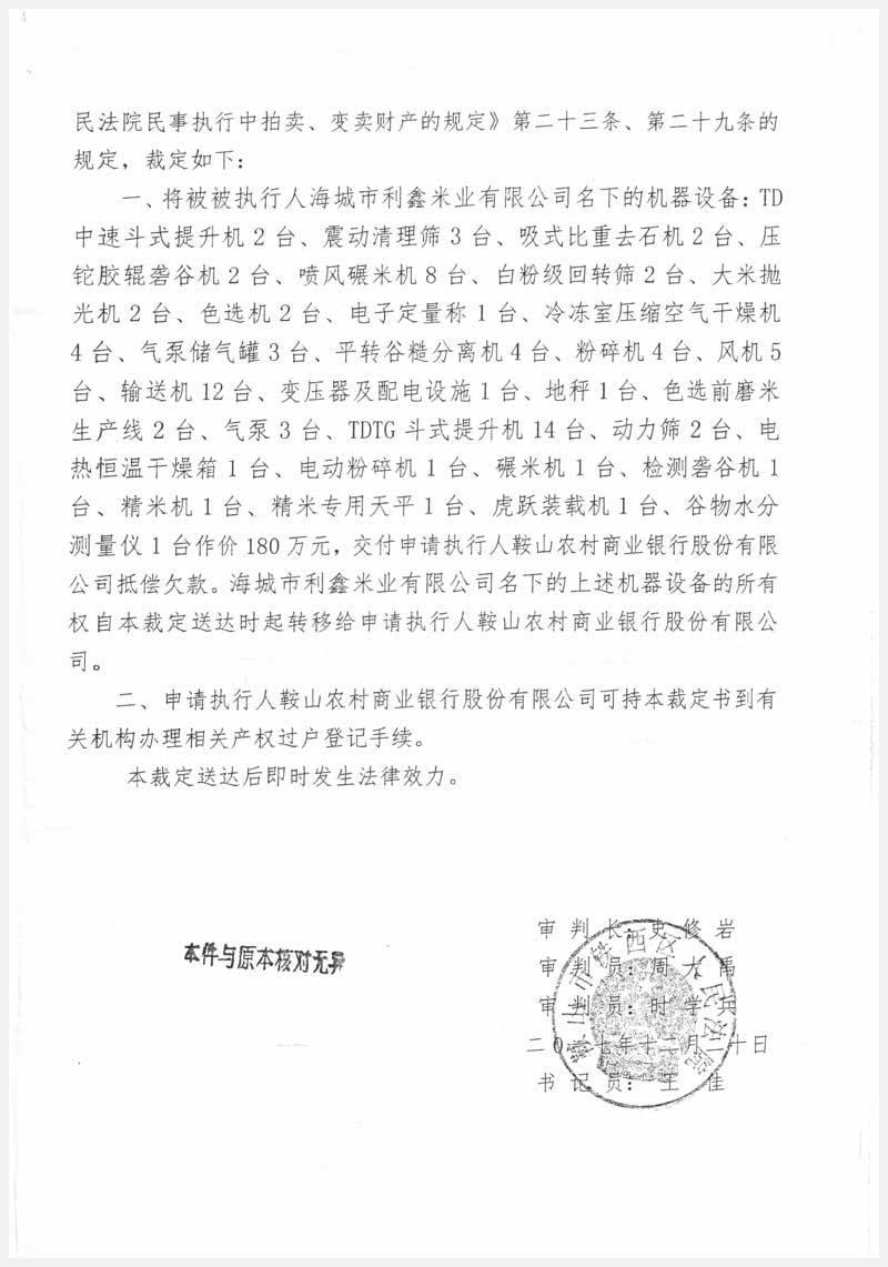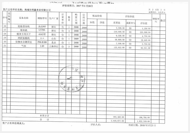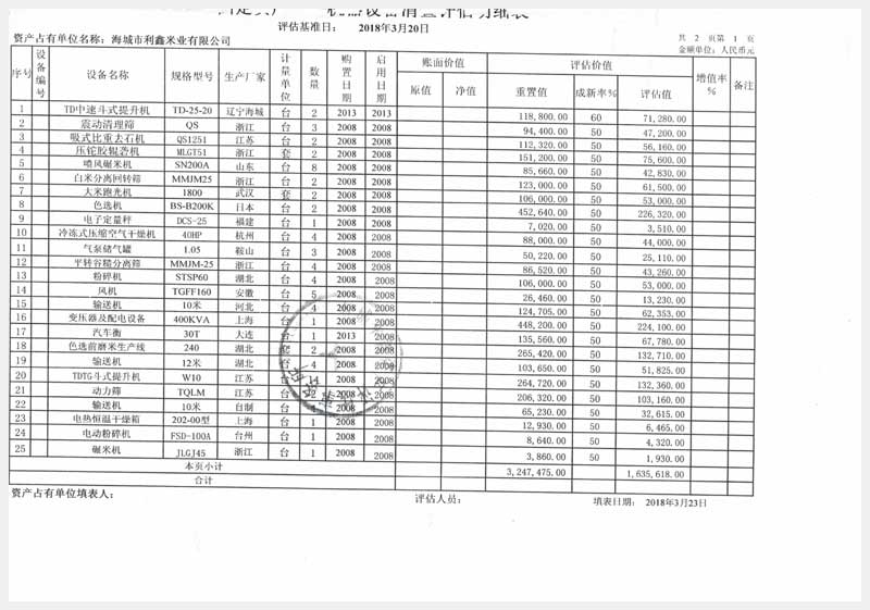 名稱:海城市利鑫米業有限公司所有的機器設備 面積:87臺 瀏覽次數:1985