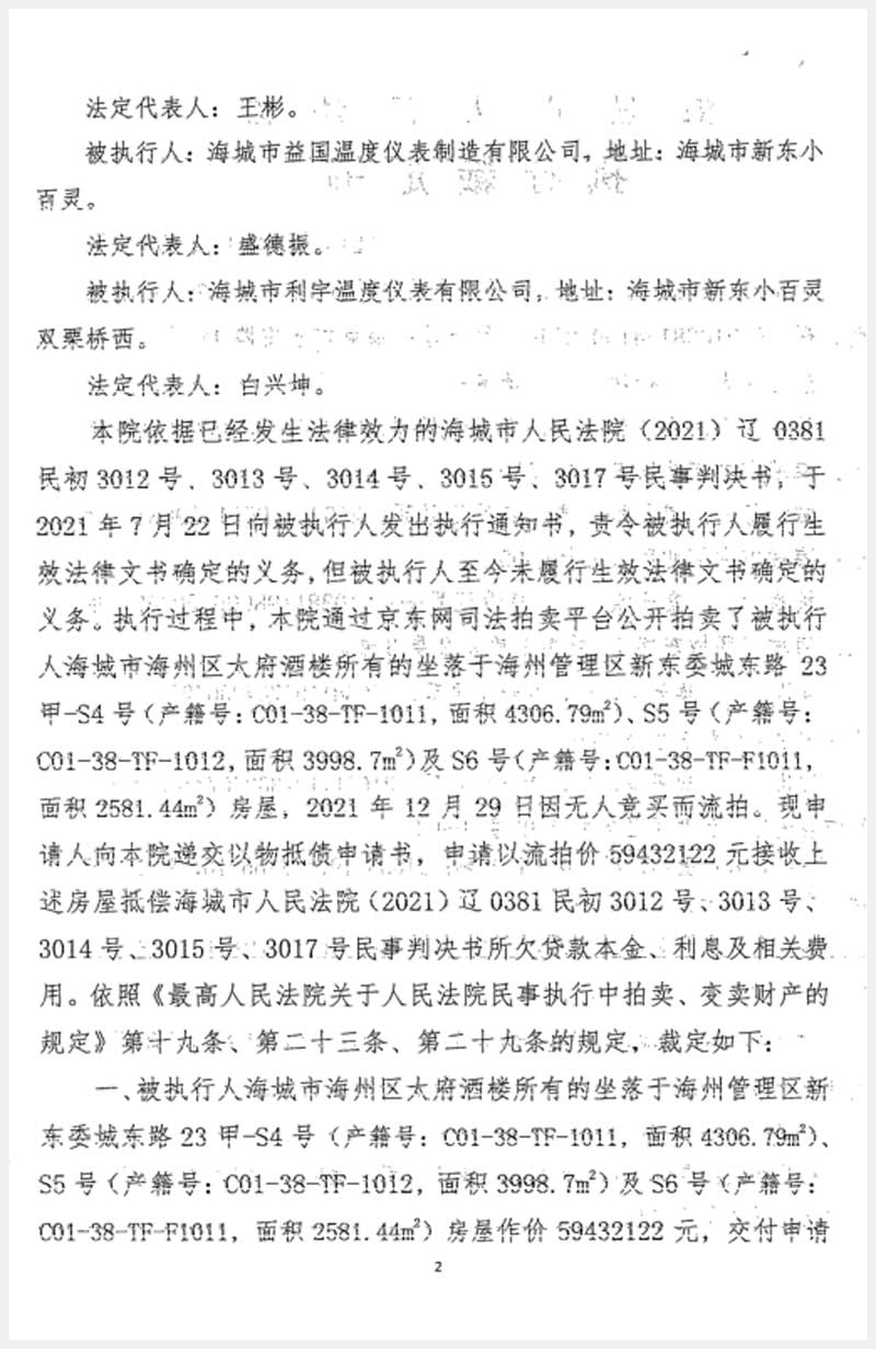 230號 海城市海州管理區東關街新東委太府酒樓23甲-S4、S5、S6號房產