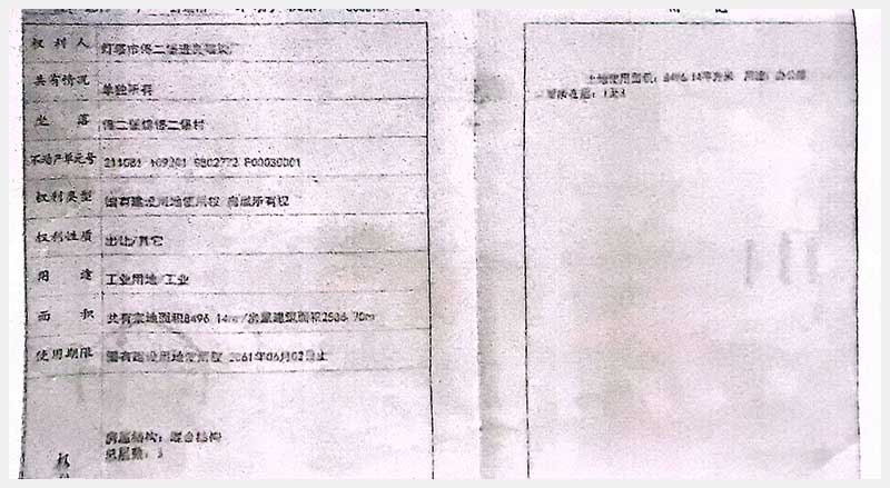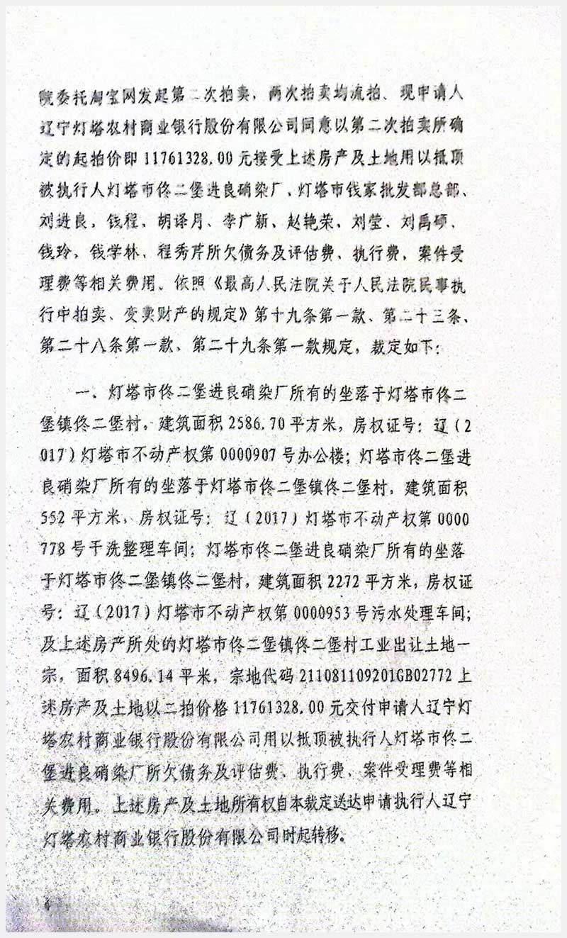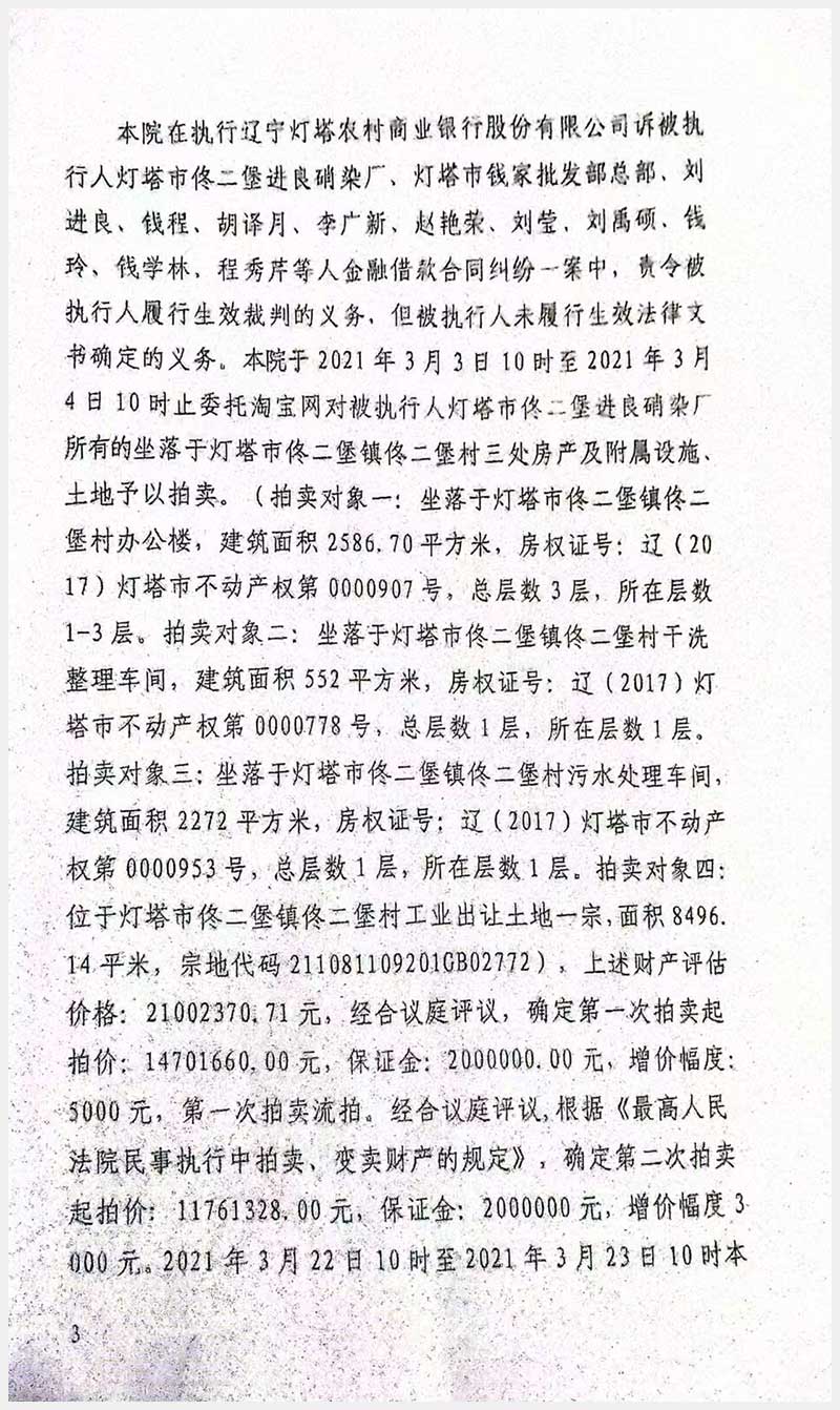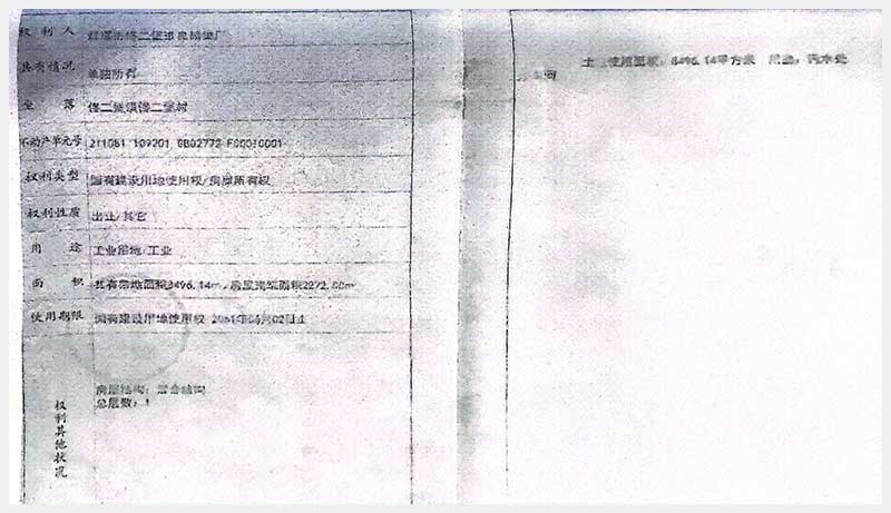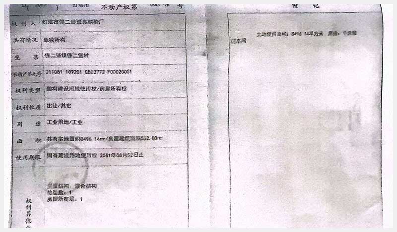 名稱:燈塔市佟二堡鎮佟二堡村房產及土地使用權 面積:房產:5,410.7㎡;土地:8,496.14㎡ 瀏覽次數:308